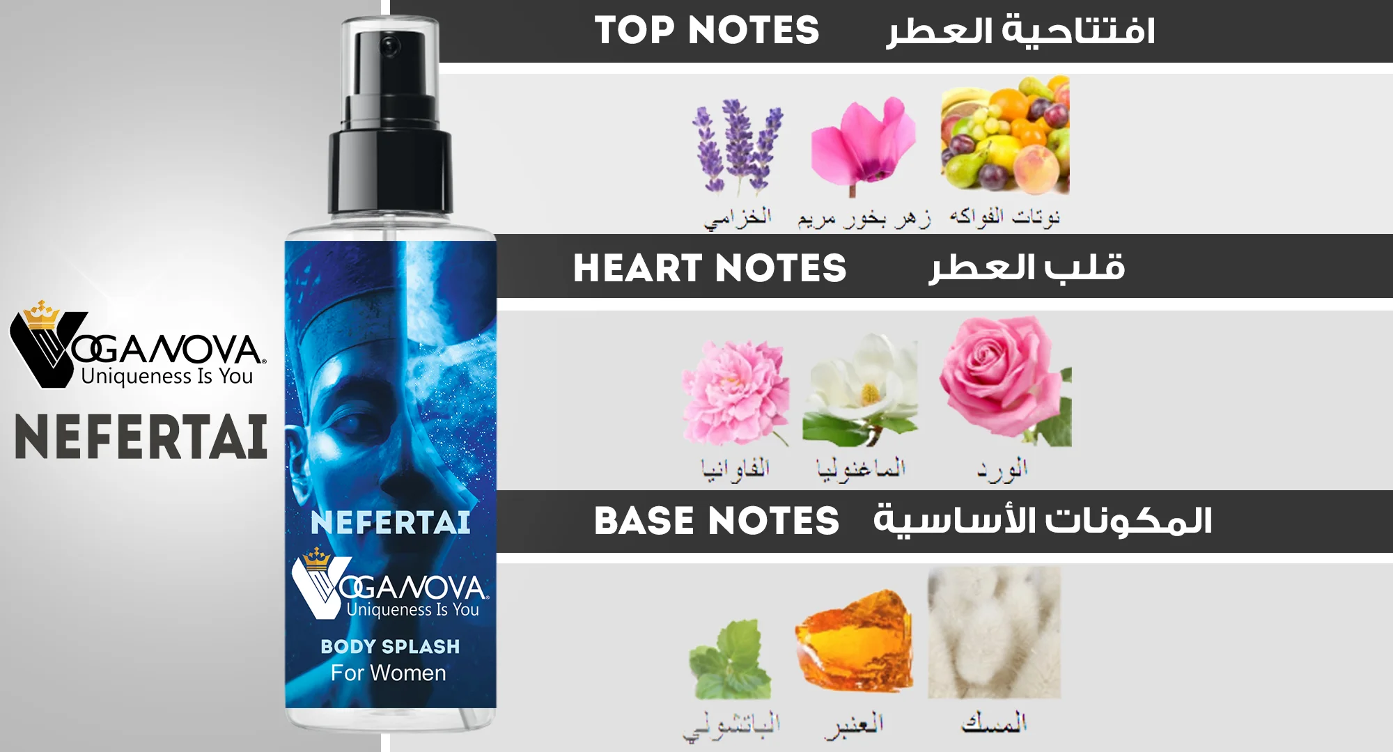 بادي سبلاش Nefertai من VogaNova: اكتشفي بادي سبلاش حريمي مستوحى من أفخم العطور العالمية بتركيبة فاخرة. اطلبي بادي سبلاش Nefertai الآن بأفضل سعر في مصر